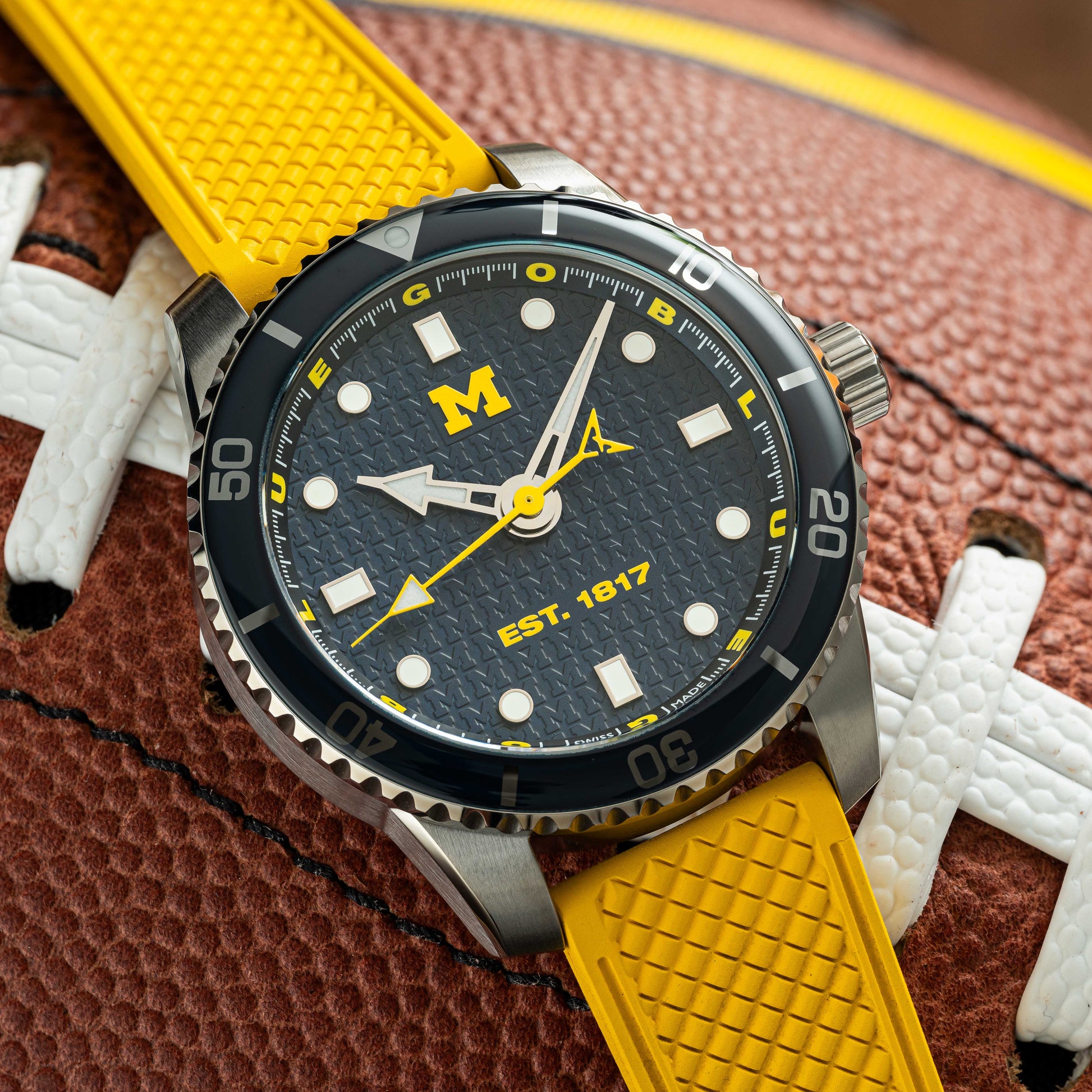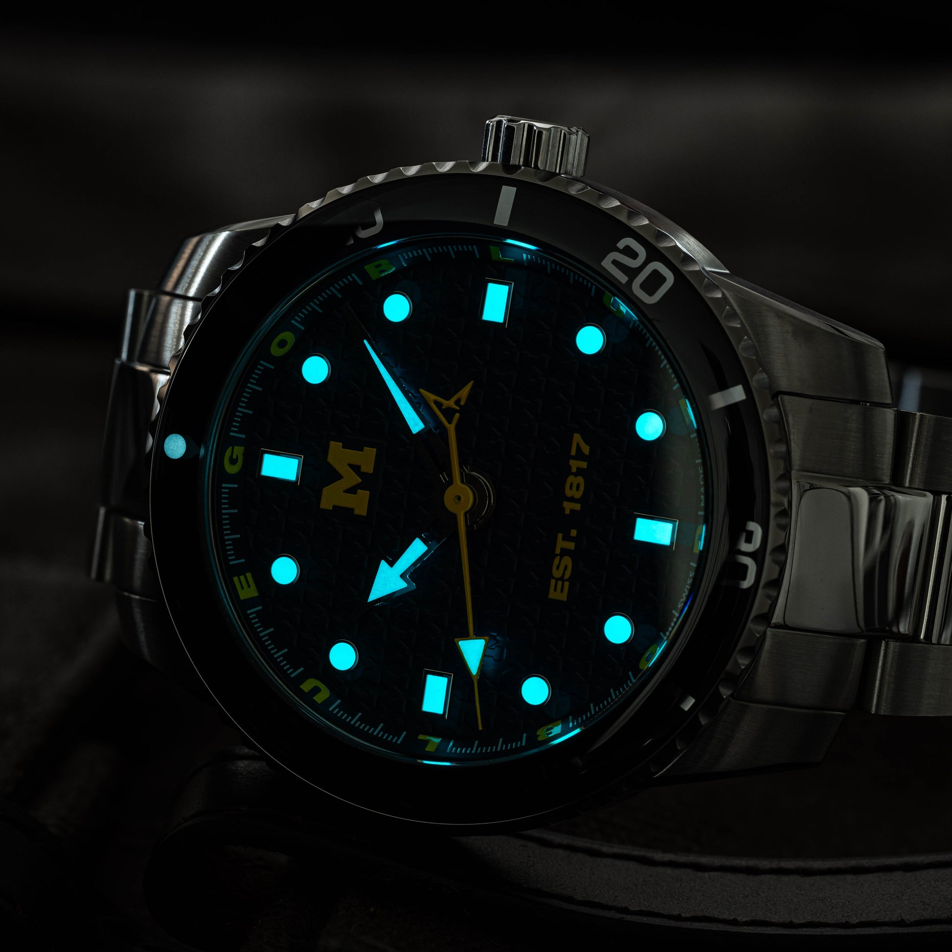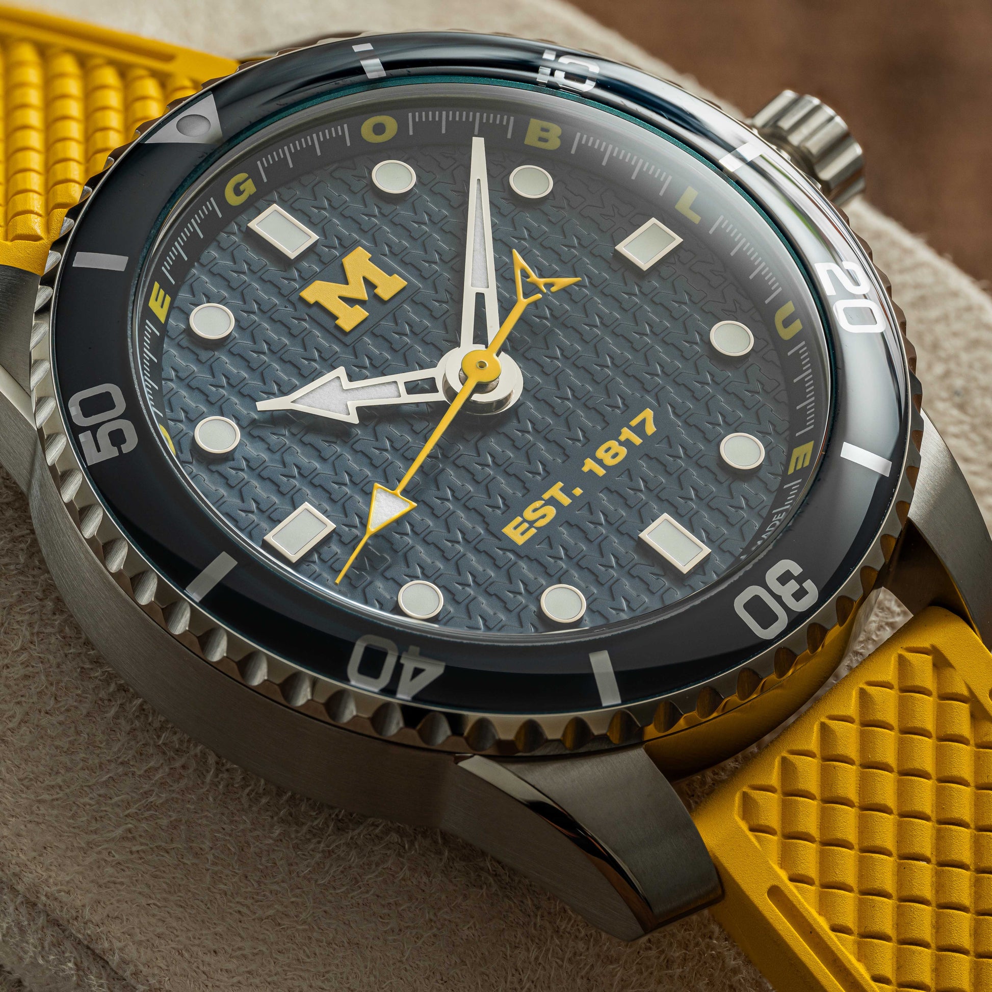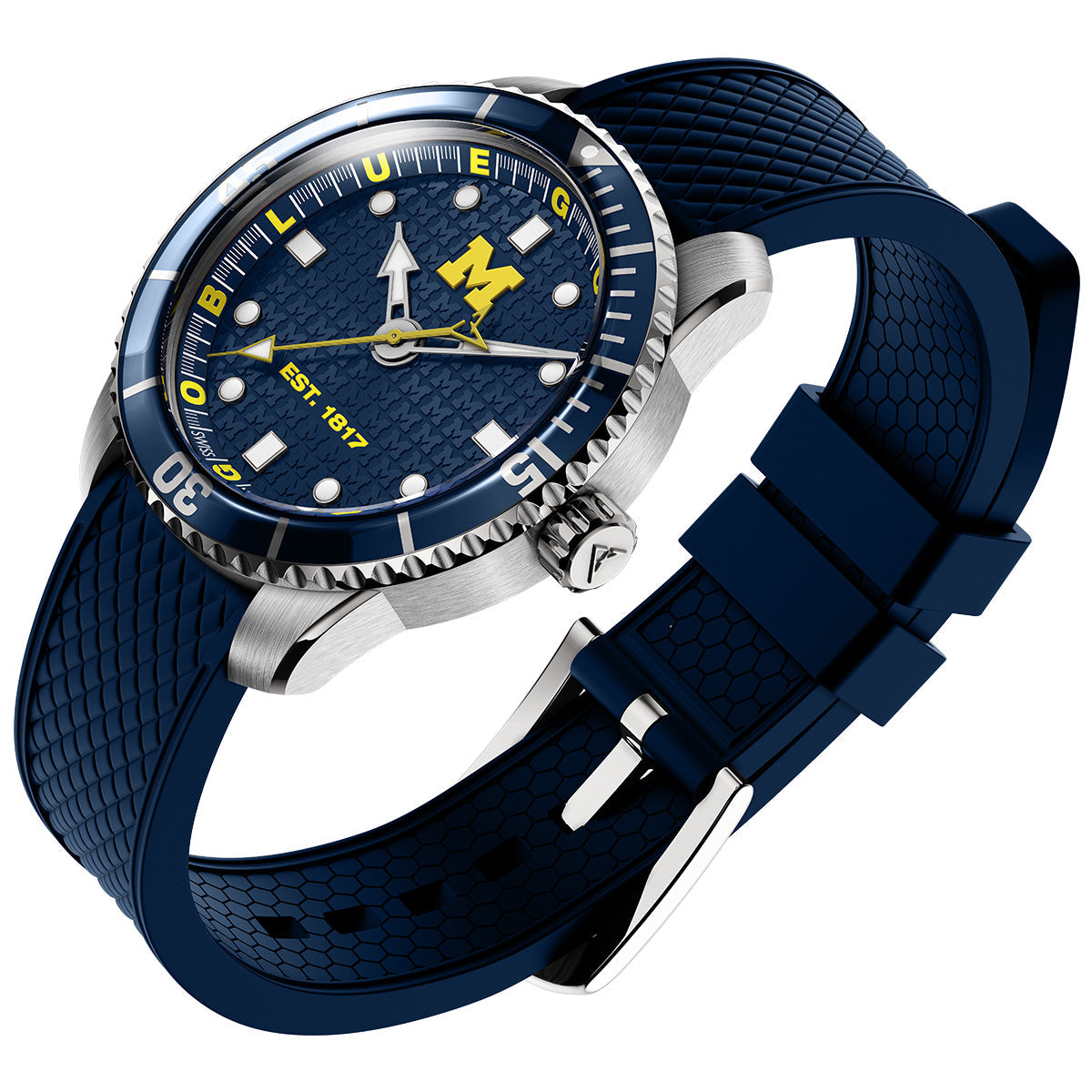 Named for one of the greatest heroes in literary history, ΟΔΥΣΣΈΑΣ—a man of intellect and versatility, strength and endurance. The University of Michigan Odysseus II comes in a 43.5mm brushed stainless-steel case with screw-down crown and is water resistant to 200 meters.