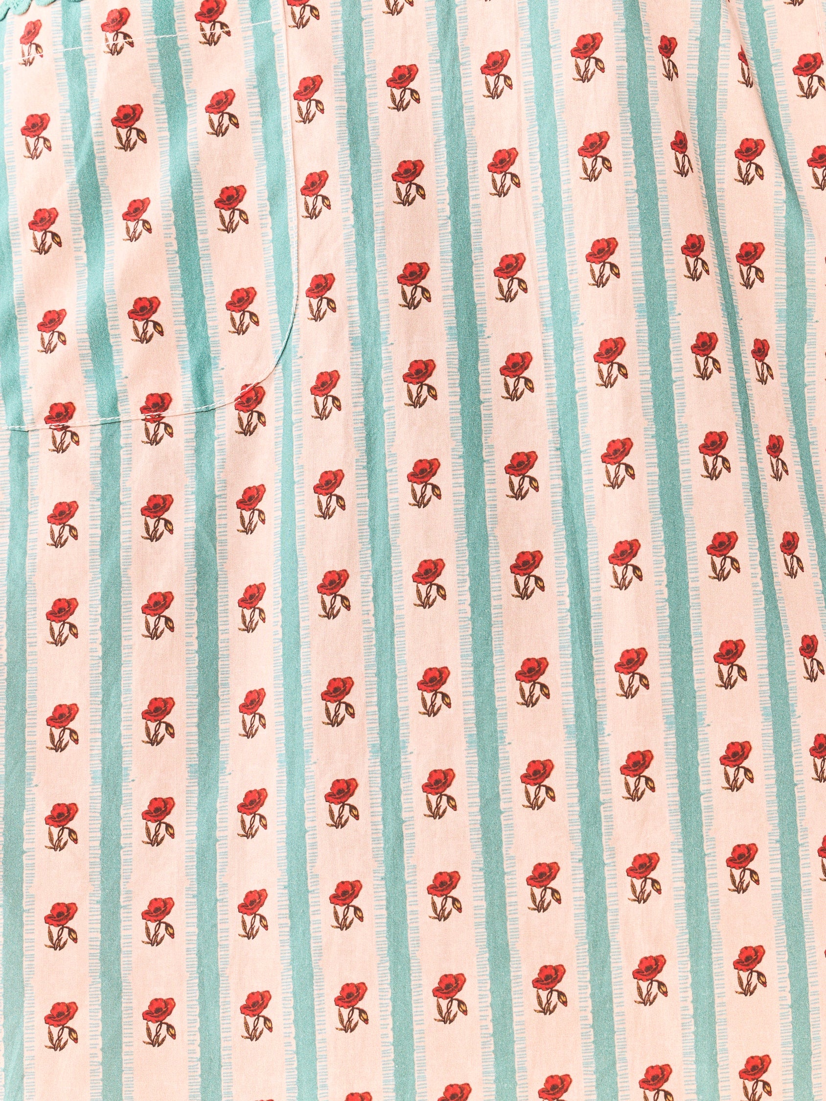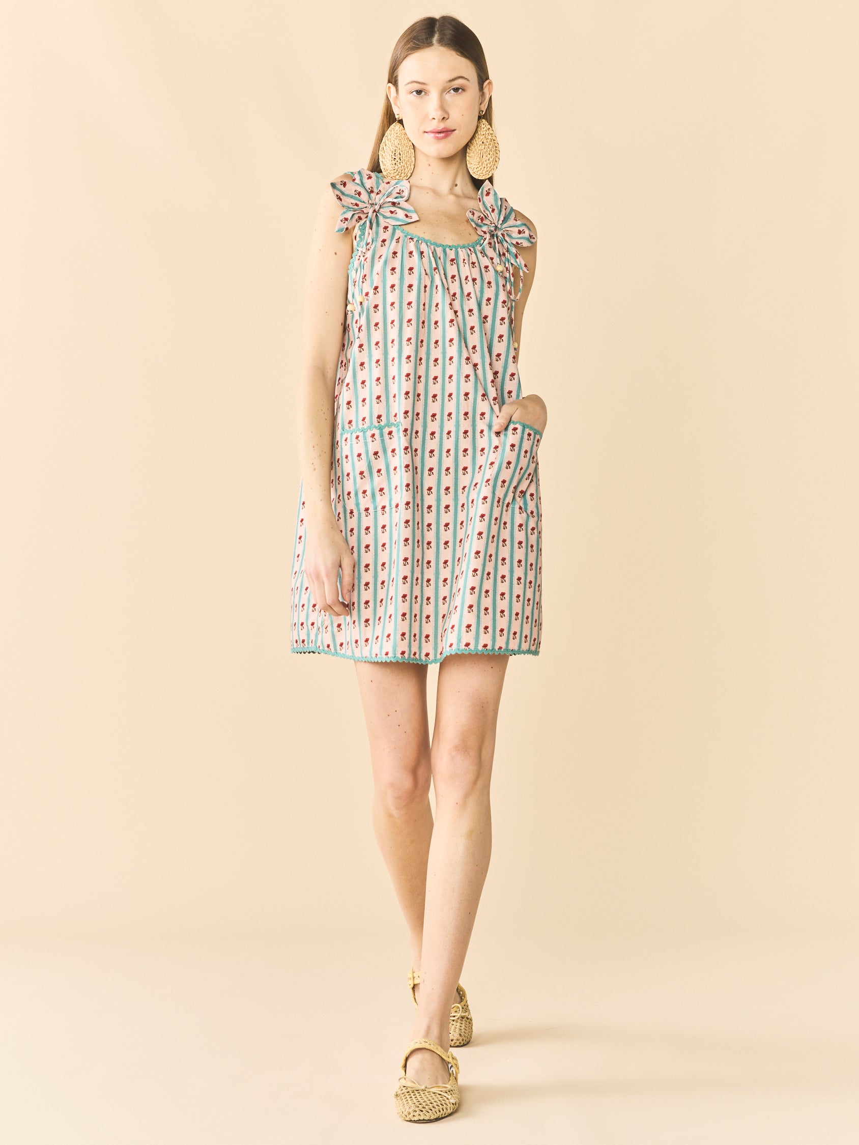 The Vanessa mini dress is a lightweight cotton dress featuring vintage-inspired stripes and ditsy floral patterns. Designed for casual wear on sunny days, it includes oversized shoulder rosettes that function as adjustable ties for fit customization. The dress also has side patch pockets for practicality, making it easy and comfortable for everyday use.
