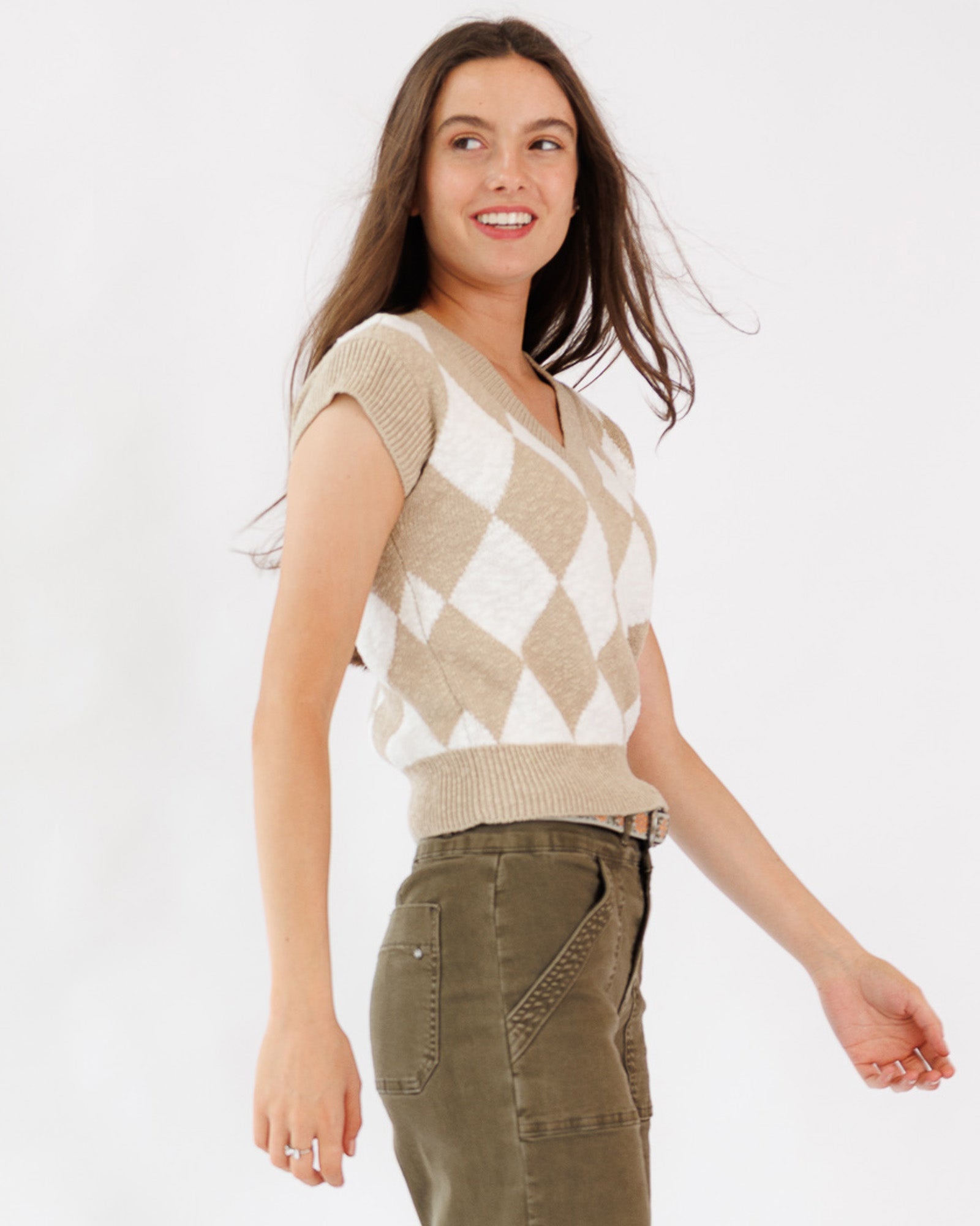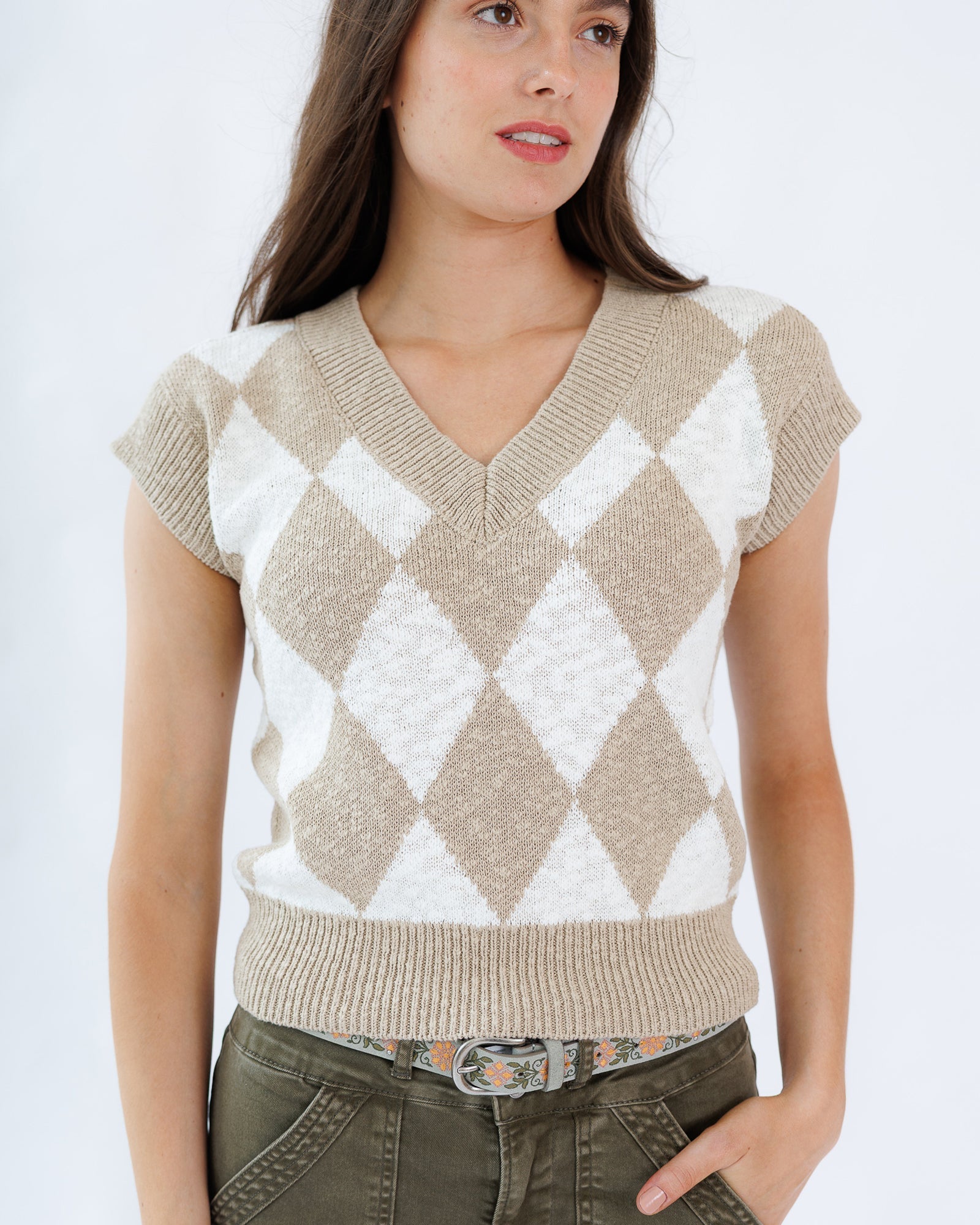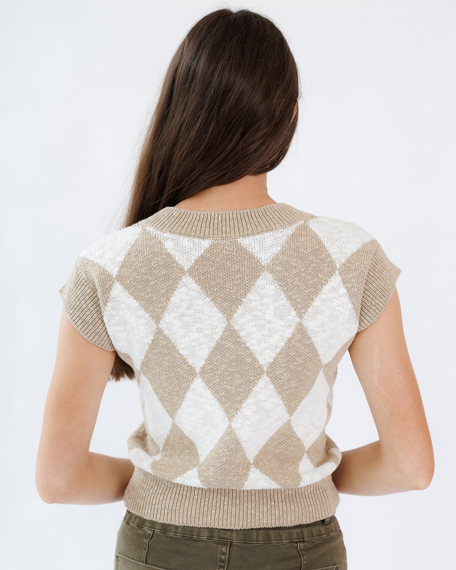 The Vermont Vest is a sleeveless sweater vest made of 100% cotton. It features a V-neckline and is available in multiple sizes with a body length around 21.5 inches in medium. This vest is suited for individuals seeking a comfortable, lightweight layering option. It is machine washable and imported. The vest can be worn over shirts or blouses for added warmth and style in casual or office environments.