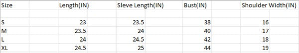 L: 43.0 (Bust), null (Waist), null (Hips), 23.8 (Length)