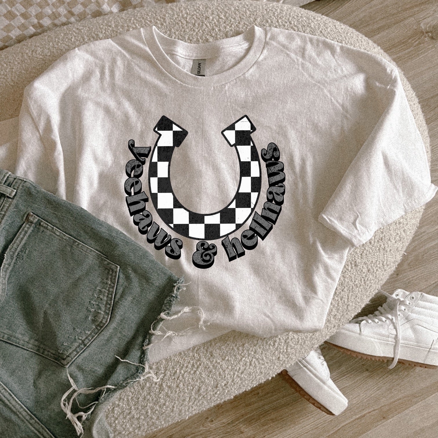 Saddle up with Yeehaws & Hellnaws, available in your choice of Gildan or Comfort Color. Experience ultimate comfort while showing off your unique style. Get ready for a wild ride with this one-of-a-kind option. (Yeehaw not included.)